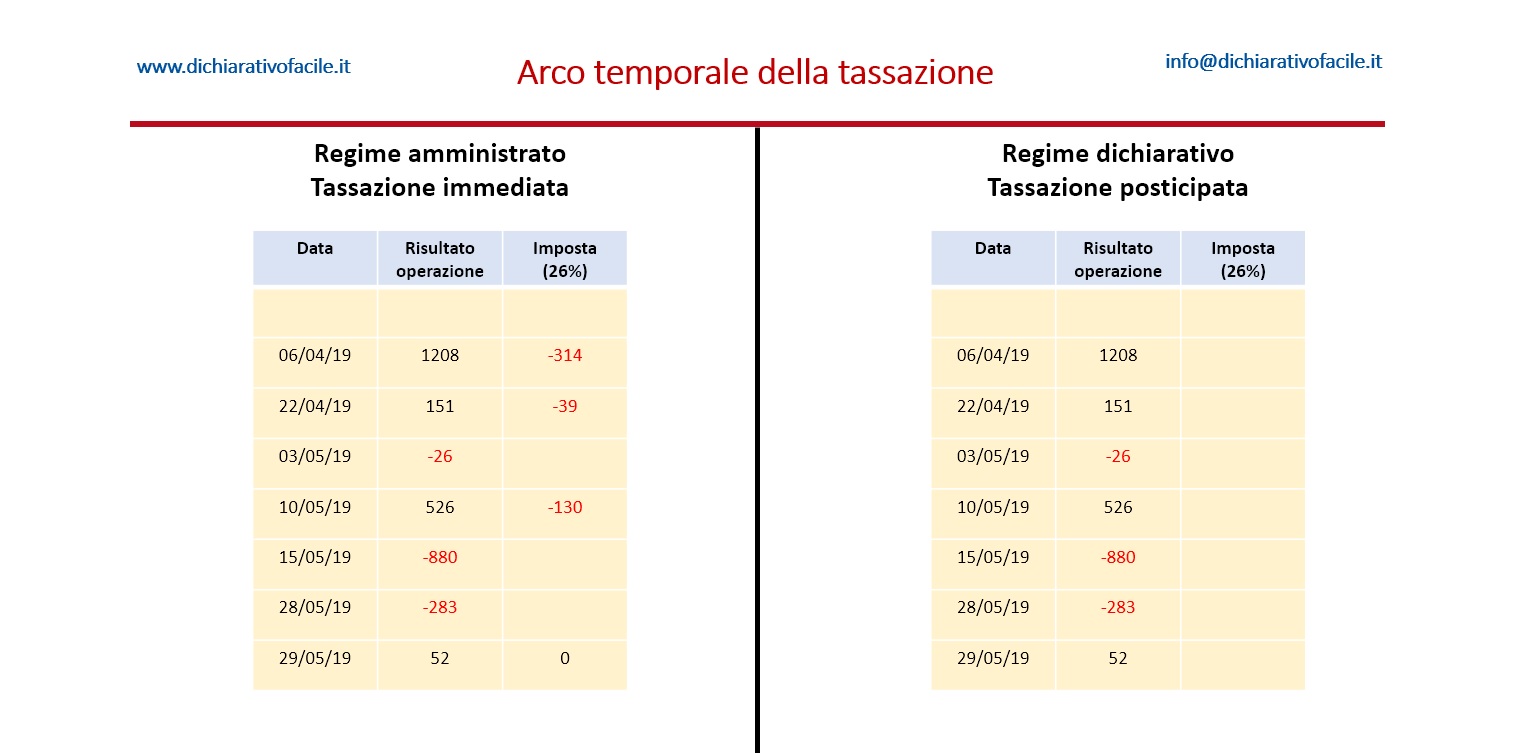Una delle principali differenze da evidenziare: in regime amministrato è il broker che pensa a prelevare le imposte, ogni volta che si chiude un’operazione calcola le imposte e le preleva. In regime dichiarativo è il titolare del conto che deve occuparsi del calcolo imposte, ed è diverso il momento in cui deve essere effettuato questo calcolo.